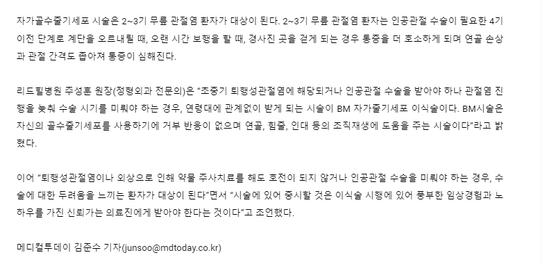자가 골수 채취한 무릎 줄기세포 주사, 관절염에도 효과 _ 메디컬투데이