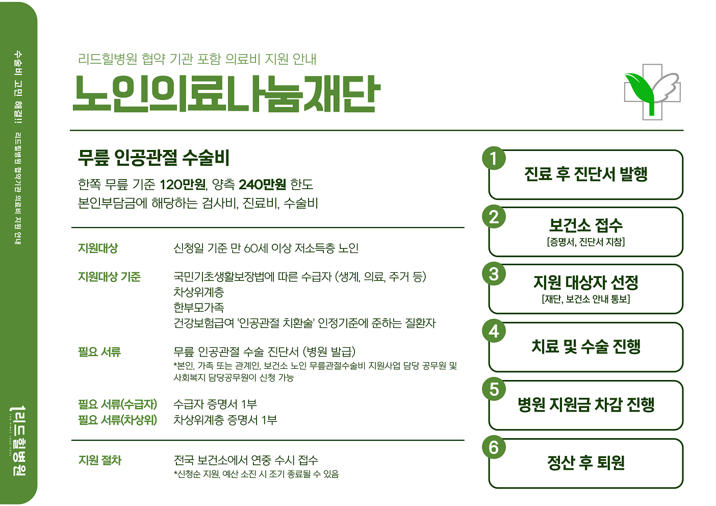 지원 혜택은? 2025년 기준 한쪽 무릎 기준 120만원, 양측 240만원 한도 본인부담금에 해당하는 검사비, 진료비, 수술비 지원 노인의료나눔재단 지원, 어떻게 신청하나요? ① 병원을 통한 지원신청 리드힐병원 등 지정된 의료기관 방문하여 상담 후 신청 가능 병원에서 직접 재단으로 서류 신청·제출 대행 가능 ② 개인 신청 노인의료나눔재단 홈페이지에서 직접 신청서 다운로드 필요 서류(소득 증빙 서류, 진단서 등)를 작성하여 재단으로 제출 ※ 리드힐병원은 신청 절차 전부터 지원 완료까지 모든 과정을 적극적으로 지원해드리고 있습니다!!