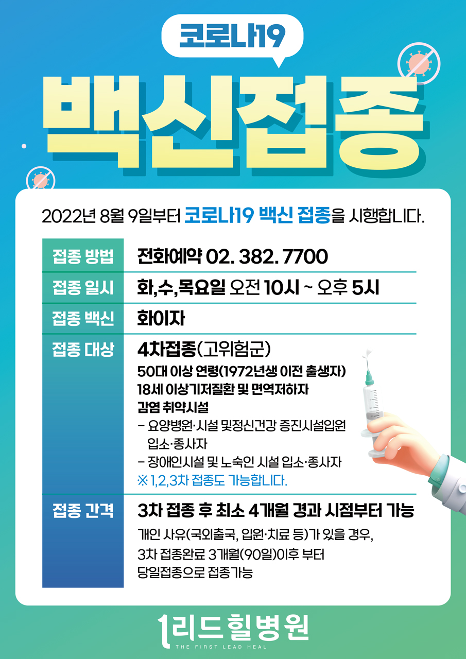 2022년 8월 9일부터 리드힐병원에서 코로나19 백신 접종을 시행합니다. 접종 방법 : 전화로 예약 ☎ 02. 382. 7700 접종 일시 : 매주 화,수,목요일 오전 10시 ~ 오후 5시 접종 백신 : 화이자 접종 대상 : 4차 접종(고위험군) 50대 이상 연령(1972년생 이전 출생자) 18세 이상 기저질환 및 면역 저하자 감염 취약시설 - 요양병원·시설 및 정신건강 증진시설 입원·입소·종사자 - 장애인시설 및 노숙인 시설 입소·종사자 ※ 1,2,3차 접종도 가능합니다. 접종 간격 : 3차 접종 후 최소 4개월 경과 시점부터 가능 개인 사유(국외출국, 입원·치료 등)가 있을 경우, 3차 접종완료 3개월(90일)이후 부터 당일 접종으로 접종가능 |