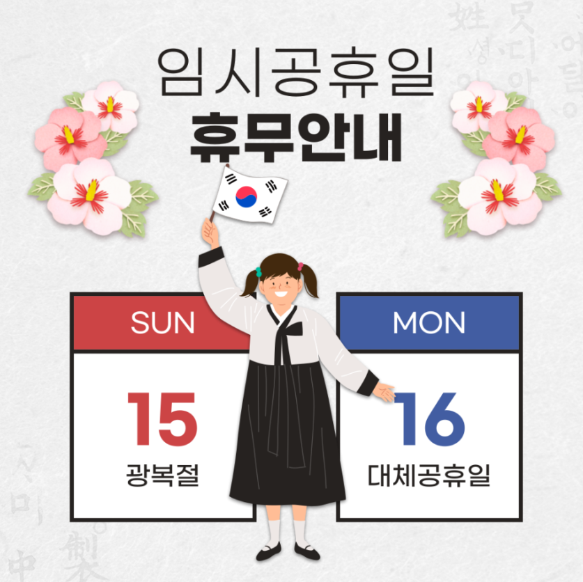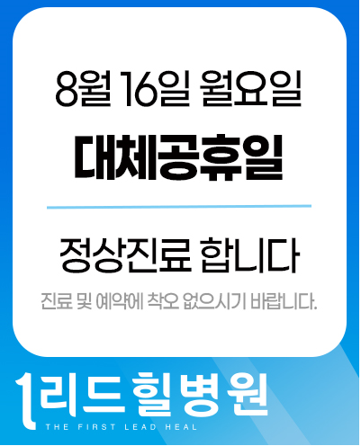 안녕하세요. 리드힐병원입니다. 8월 15일이 바로 광복절이죠. 1945년 우리나라가 일본으로부터 해방된 것을 기념하고 임시정부 법통을 계승한 대한민국 정부수립을 축하하는 날이니만큼 모두가 한 마음 한 뜻으로 태극기를 정성스레 달아두고 사회적거리두기에 동참하면 좋을 것 같습니다. 이제 공휴일이 주말에 껴있으면 대체공휴일로 다음주에 쉬게끔 되었는데 저희 리드힐병원은 환자분들의 편의를 위해! 8월 16일 (월) 대체 휴무일에도 정상진료를 하오니 이점 꼭 참고하셔서 내원에 불편함이 없으시길 바라겠습니다. |