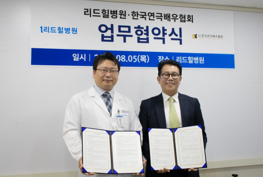 안녕하세요. 리드힐병원입니다. 오늘은 업무협약식 소식을 들고 왔어요! 바로바로! 한국연극배우협회인데요. 원장님과 협회장님 사진부터 보실까요? 찰칵! 푸근한 인상과 여유로운 미소 어쩐지 두분의 인상이 비슷하게 느껴진 건 저희뿐일까요!?
