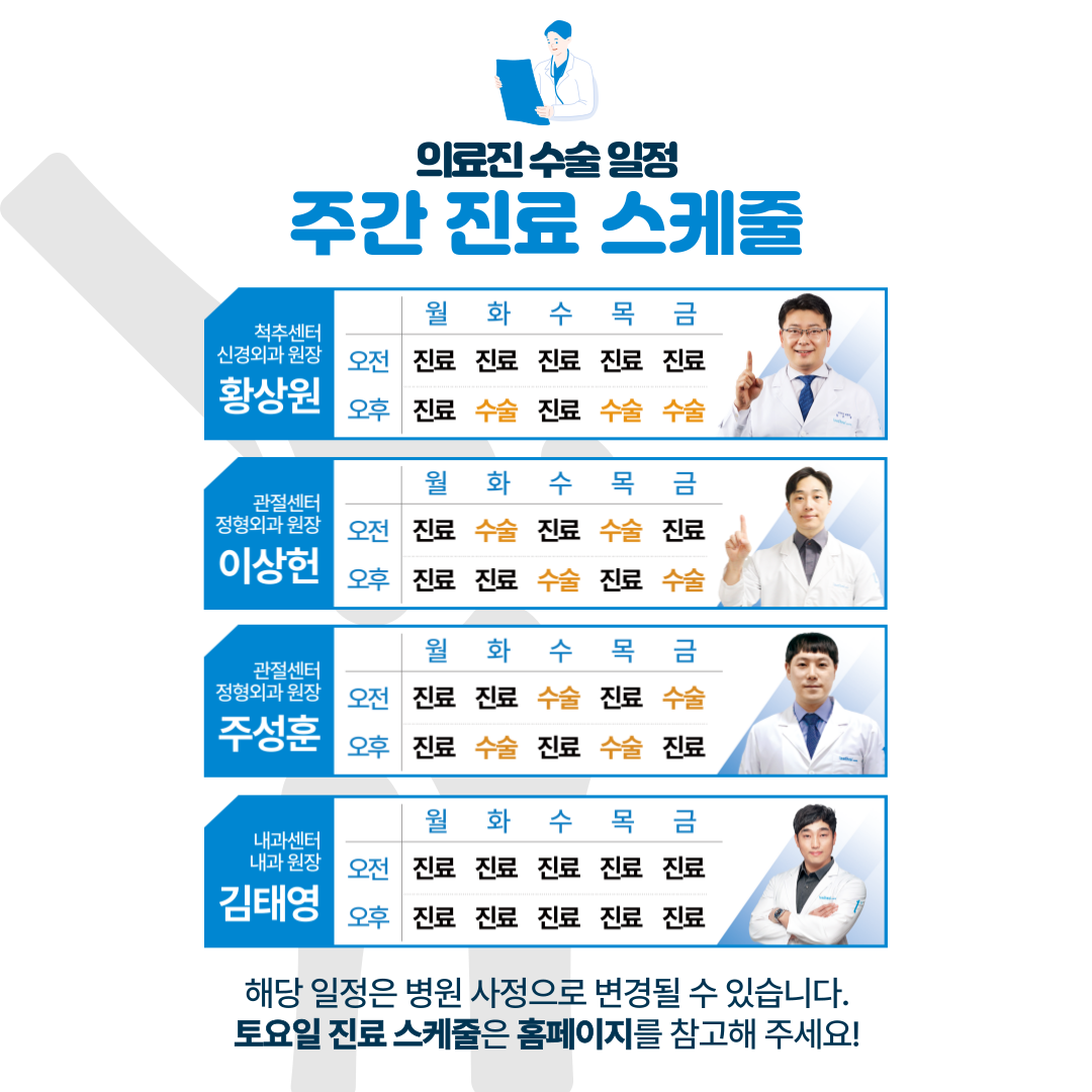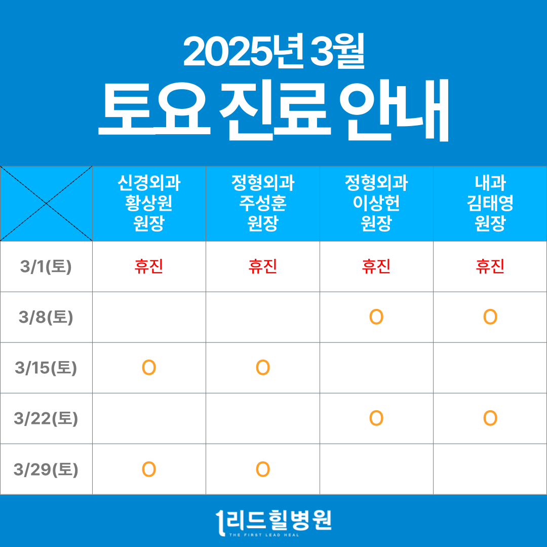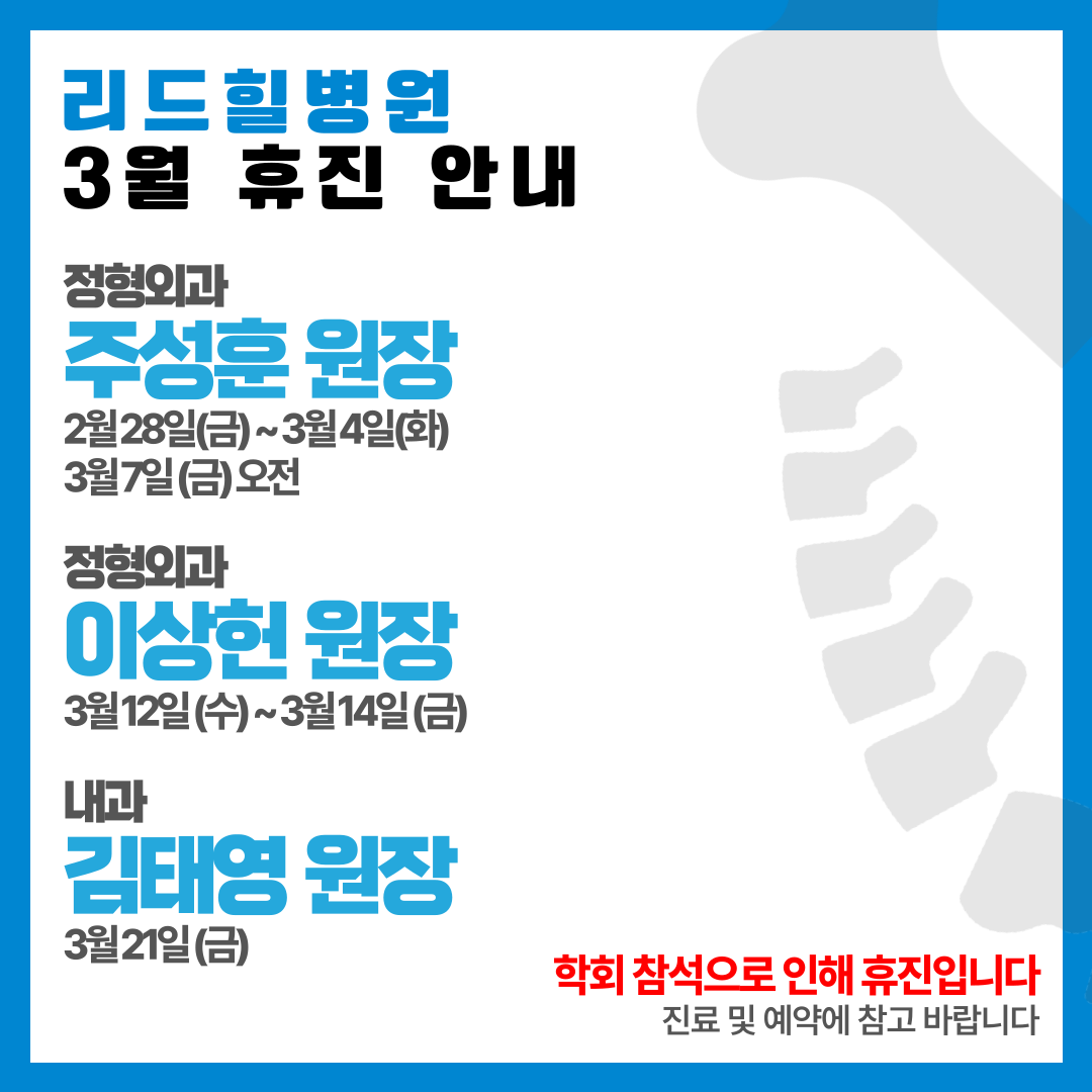 2025년 3월 리드힐병원 진료 일정 안내 안녕하세요, 리드힐병원입니다! 2025년 3월 진료 일정 공지드리겠습니다! ![]() 신경외과 황상원 원장님은 화요일 오후, 목요일 오후, 금요일 오후 수술 입니다! 정형외과 이상헌 원장님은 화요일/목요일 오전, 수요일/금요일 오후 수술 입니다! 정형외과 주성훈 원장님은 수요일/금요일 오전, 화요일/목요일 오후 수술 입니다! 내과 김태영 원장님은 종일 진료십니다! 수술 일정이 있을 땐 진료가 어려우니, 참고 하여 예약해주시면 감사드리겠습니다! ![]() 3월 토요 진료 안내입니다! 3/1(토) : 휴진 3/8(토) : 정형외과, 내과 3/15(토) : 신경외과, 정형외과 3/22(토) : 정형외과, 내과 3/29(토) : 신경외과, 정형외과 토요일 진료는 14:00까지 점심시간 없이 운영됩니다! ![]() 의료진 휴진 안내 정형외과 주성훈 원장님 - 2월 28일(금) ~ 3월 4일(화) 휴진 - 3월 7일(금) 오전 휴진 정형외과 이상헌 원장님 - 3월 12일(수) ~ 3월 14일(금) 휴진 내과 김태영 원장님 - 3월 21일(금) 휴진 3월, 추웠던 겨울이 지나고 새싹들이 자라나고 있습니다. 이번 달에도 환자 분들의 신뢰를 바탕으로 더 신속/정밀한 진료로 찾아뵙겠습니다! 오늘도 건강한 하루 보내세요! |