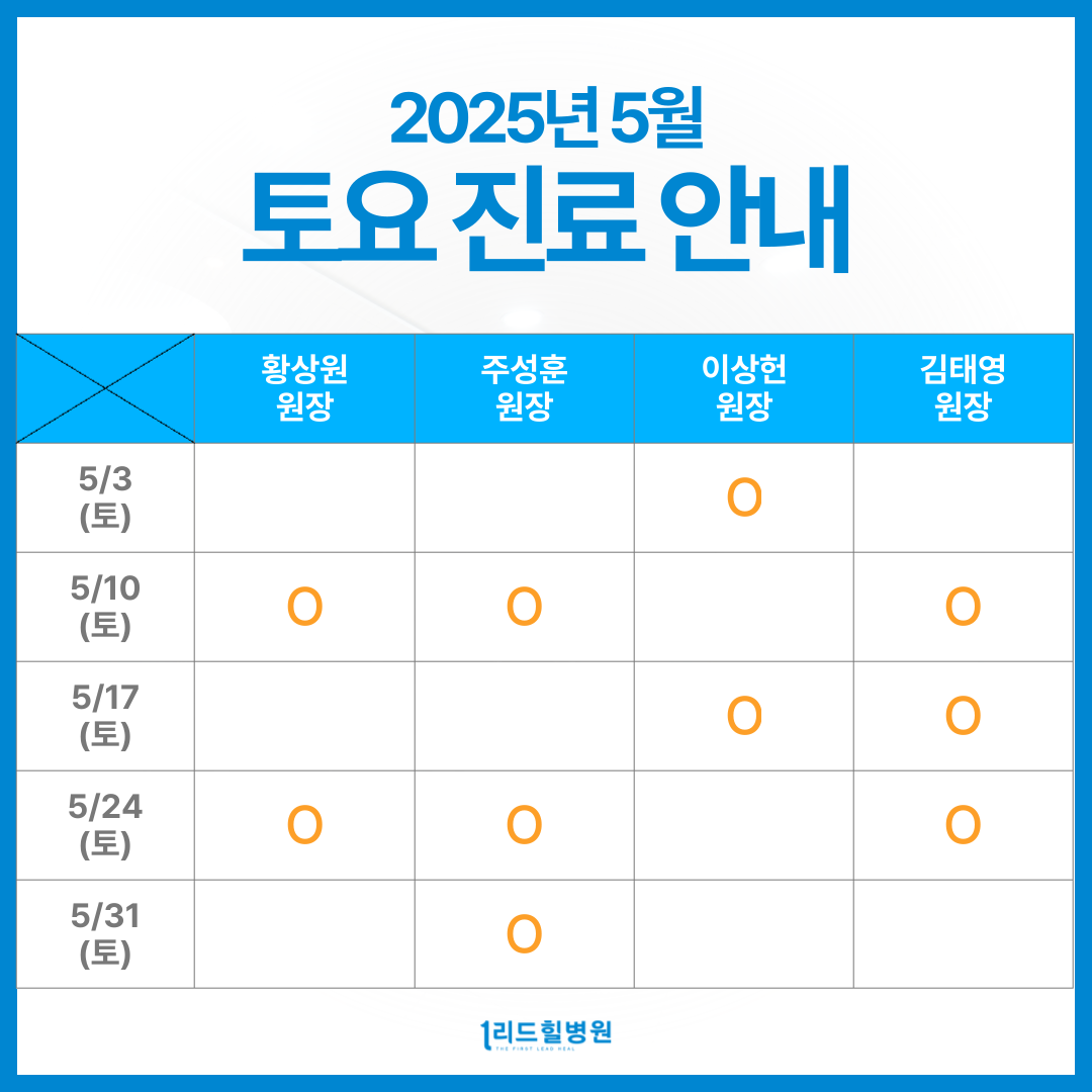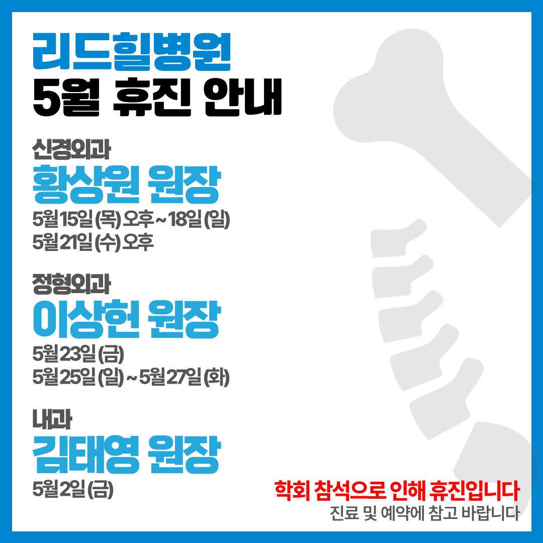 2025년 5월 리드힐병원 진료 일정 안내 안녕하세요, 리드힐병원입니다! 2025년 5월 진료 일정 공지드리겠습니다! ![]() 신경외과 황상원 원장님은 화요일 오후, 목요일 오후, 금요일 오후 수술 입니다! 정형외과 이상헌 원장님은 화요일/목요일 오전, 수요일/금요일 오후 수술 입니다! 정형외과 주성훈 원장님은 수요일/금요일 오전, 화요일/목요일 오후 수술 입니다! 내과 김태영 원장님은 종일 진료십니다! 수술 일정이 있을 땐 진료가 어려우니, 참고 하여 예약해주시면 감사드리겠습니다! ![]() 5월 토요 진료 안내 5/3(토) : 정형외과 5/10(토) : 신경외과, 정형외과, 내과 5/17(토) : 정형외과, 내과 5/24(토) : 신경외과, 정형외과, 내과 5/30(토) : 정형외과 토요일 진료는 14:00까지 점심시간 없이 운영됩니다! ![]() 의료진 휴진 안내 신경외과 황상원 원장님 - 5월 15일(목) 오후 ~ 18일(일) - 5월 21일(수) 오후 정형외과 이상헌 원장님 - 5월 23일(금) - 5월 25일(일) ~ 27일(화) 내과 김태영 원장님 - 5월 2일(금) ![]() 공휴일 진료/휴진 안내 5월 1일(목) 근로자의 날 09:00~16:00 진료 5월 5일(월) 어린이날/석가탄신일 휴진 5월 6일(화) 대체공휴일 09:00~16:00 진료 5월, 꽃이 만개하고, 날씨도 점점 더워지고 있는데요! 이번 달에도 환자 분들의 신뢰를 바탕으로 더 신속/정밀한 진료로 찾아뵙겠습니다! 감기 조심하시고 오늘도 건강한 하루 보내세요! |