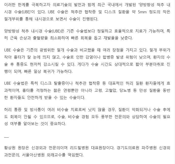 척추센터 황상원 원장님께서 협착증과 디스크 질환에 효과적인 UBE 수술 관련 내용으로