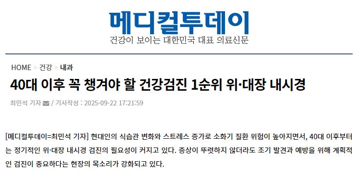 [언론 보도] 40대 이후 꼭 챙겨야 할 건강검진 1순위 위·대장 내시경