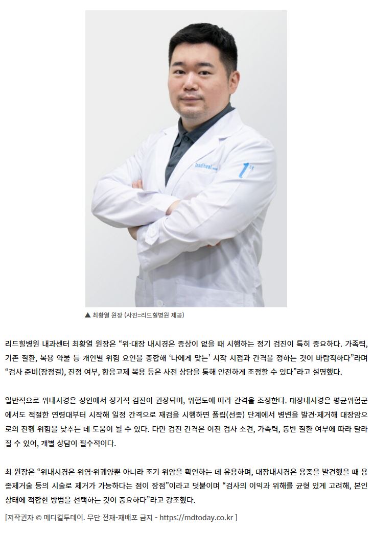 내과센터 최황열 원장님께서 40대 이후 챙겨야 할 건강검진인 위내시경, 대장내시경 관련 내용으로